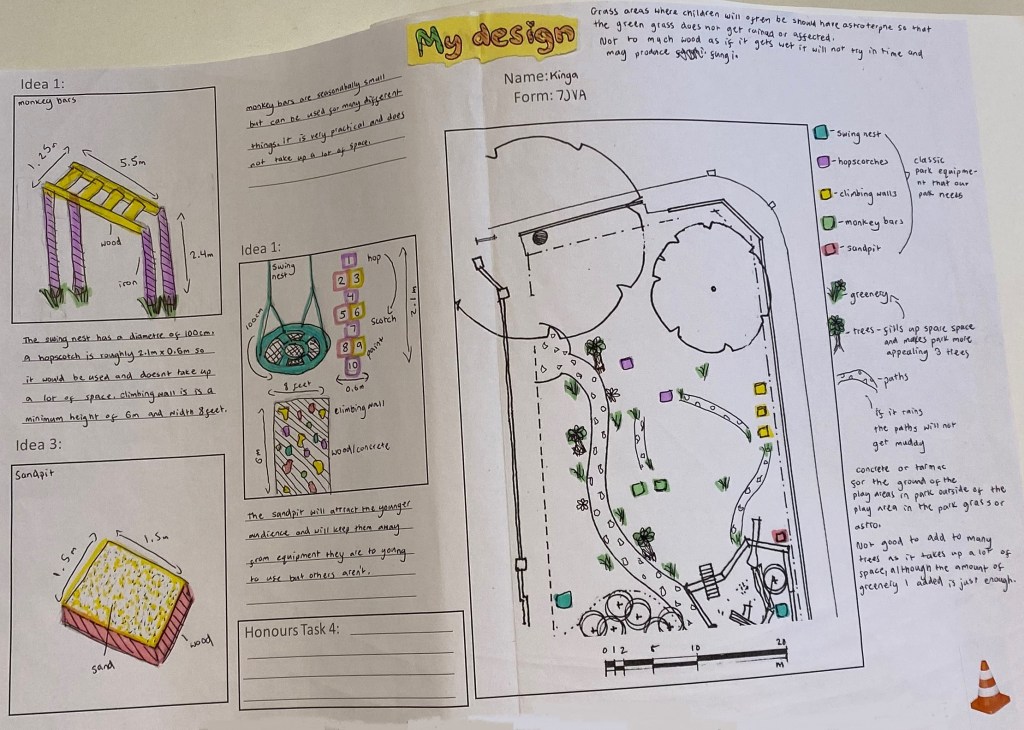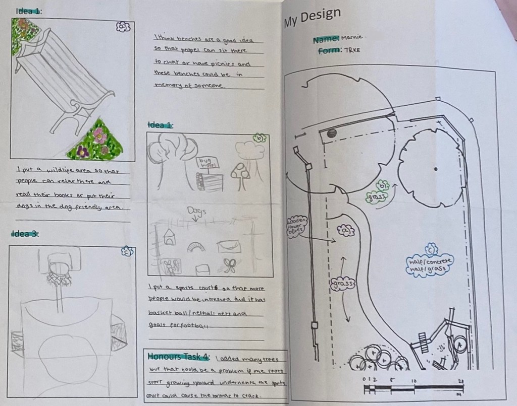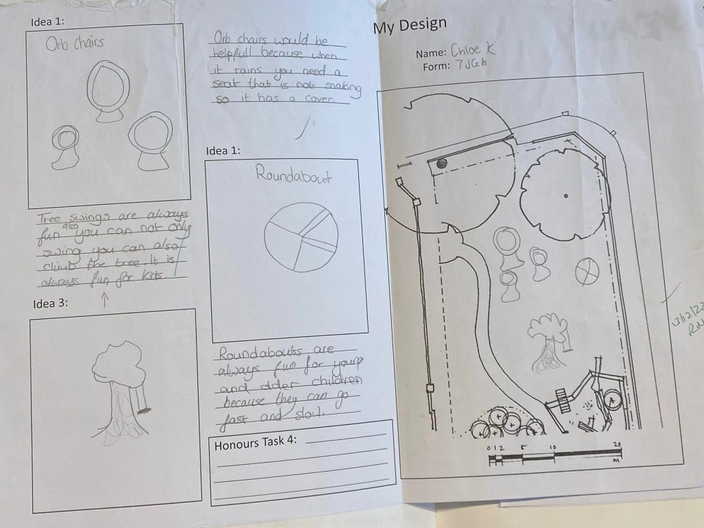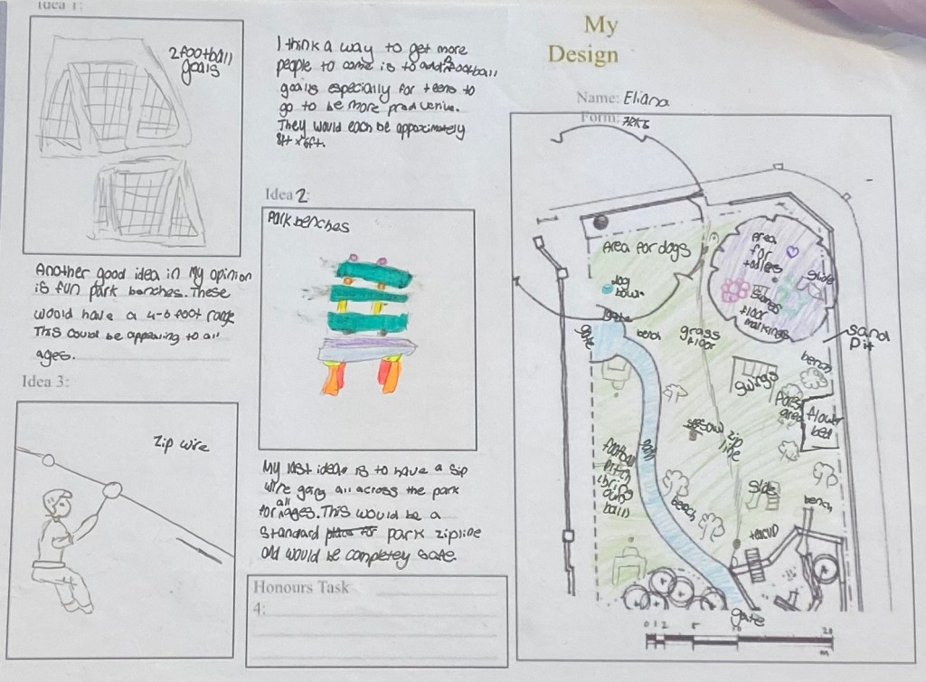 We were surprised that seating came up again and again. Students wanted places to read, play games and socialise. Ideas included treehouses, tables with built-in chessboards, painted bespoke benches, gazebos and orb chairs so the park could be enjoyed in the rain.