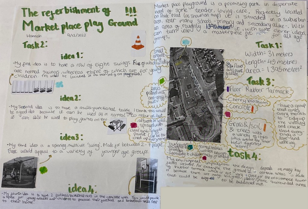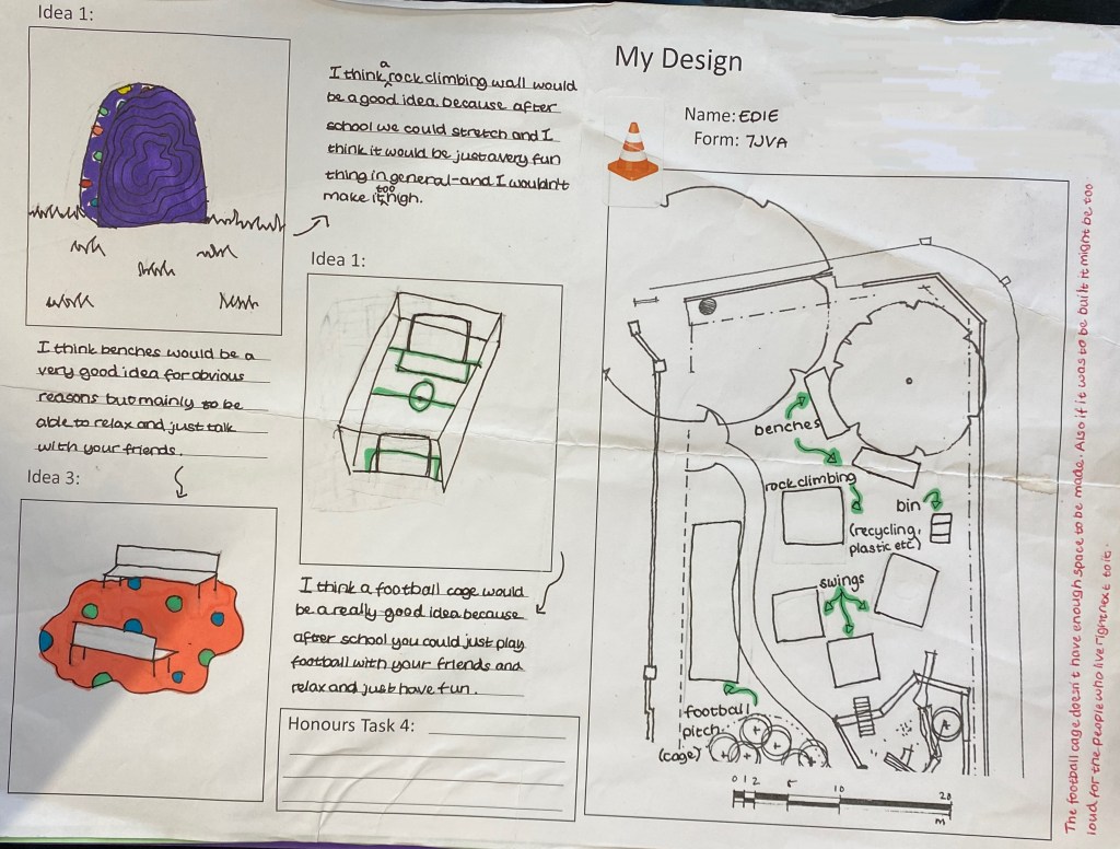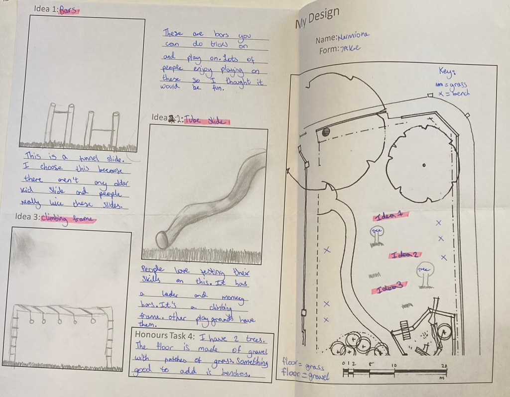 11 students presented their designs to the Friends of Market Place Playground and we were delighted by their creativity, research, understanding of budget and space limitations, consideration of other playground users like toddlers or older people and their concern for the environment.